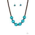 Brown wooden beads are threaded along shiny brown cording. Brushed in a vivacious finish, dramatic blue wooden beads alternate below the collar for a bold summer look. Features a button loop closure.