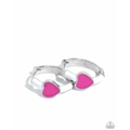 Connected to a silver hinge hoop, a strip of white paint curls towards the front of the ear, proudly displaying the Pink Peacock-painted dainty heart at its center for a romantic statement. Earring attaches to a standard hinge closure fitting. Hoop measures approximately 1/2" in diameter.
