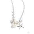 Infused along an invisible string, a collection of cloudy ivory acrylic beads, silver discs, silver beads, and chiseled white shells pattern around the neckline for a whimsical arrangement. Silver coastal-inspired charms including a turtle, a piece of coral, a natural shell, a starfish, and an oversized silver turtle with iridescent flecks on its shell cascade and sway for an oceanic opulent finish. Features an adjustable clasp closure. Due to its prismatic palette, color may vary.