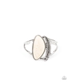 Dotted with a dainty silver flower, a lifelike silver feather charm curves around an asymmetrical white stone centerpiece atop an airy silver cuff.