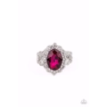 Dotted in dainty white rhinestones, a scalloped silver frame gathers around an oversized pink gem atop ornately studded silver bands for a glitzy look. Features a dainty stretchy band for a flexible fit.