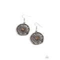 Hammered silver spokes flare out from a golden topaz rhinestone center, resulting in a studded silver frame. Earring attaches to a standard fishhook fitting.