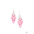A glassy collection of pink teardrop, oval, and round crystal-like beads taper at the bottom of a silver half moon frame that is suspended by dainty silver chains. Matching beading swings from the top of the frame, creating a whimsical chandelier. Earring attaches to a standard fishhook fitting.