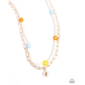 Infused along an invisible string, glossy white pearls, haphazardly interrupted by pearl-centered orange, blue, and yellow flowers, loop around the neckline for a refined statement. Gold paperclip chain links layer below the pearly strand, leading the eye to a solitaire baroque pearl painted in multicolored floral detailing, for a spring-inspired spot of color and whimsy. Features an adjustable clasp closure.