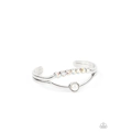 A row of iridescent rhinestones and a solitaire white pearl adorn the layered center of a classic silver cuff, creating a timeless piece around the wrist.
