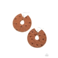 Dotted in distressed textures, a brown leather teardrop is spliced into a trendy fringe-like pattern. Earring attaches to a standard fishhook fitting.