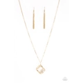 Gold circles join into an alluring 3-D box. A detached white gem freely sits in the gold box creating the illusion of a floating gem. The bright gold and dazzling gem create an incandescent design. Features an adjustable clasp feature.
