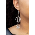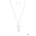 A collection of oval and round silver links, embellished with a faceted white bead suspended inside the bottom most round frame, coalesce into a flirty charm as it sways from the bottom of a lengthened dainty silver chain. Features an adjustable clasp closure.