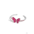 A Rose Violet-painted butterfly with pink rhinestone wings and a pink-rhinestone body delicately perches atop a shiny silver cuff. Additional pink rhinestones line the edges of a sleek silver cuff for a whimsically radiant centerpiece.