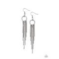 Infused with a sparkly strand of glassy white rhinestones, tapered strands of dainty gunmetal ball chain stream from the bottom of a white rhinestone encrusted ring for a glamorously glittery look. Earring attaches to a standard fishhook fitting.