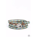 Infused with an antiqued heart and pawprint embossed button, a row of blue and green multicolored cloudy and milky beads are knotted in place along two brown leather cords, creating multiple earthy layers around the wrist with its extended length. Features an adjustable button loop closure.