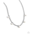 Embellished along a silver curb chain, white square gems pressed in silver-pronged fittings give way to glossy white pearls for a refined, radiant display below the neckline. Features an adjustable clasp closure.