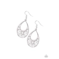 An array of white pearls collect at the bottom of a shimmery silver teardrop, creating a timeless frame. Earring attaches to a standard fishhook fitting.