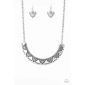 Stamped in decorative geometric patterns, an antiqued silver crescent plate swings below the collar for a tribal inspired look. Features an adjustable clasp closure.