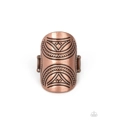 Stamped in triangular tribal inspired motifs, a copper oval frame curls around the finger for a rustic flair. Features a stretchy band for a flexible fit.