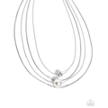 Four sleek silver snake chains drape below the neck in a layered fashion. The shortest chain is accented with a rhinestone-studded sphere, the middle and longest chain features a single silver curved bar, and the third chain is adorned with a large white pearl. The elegant arrangement of delicate charms and snake chains creates a polished and sophisticated design. Features an adjustable clasp closure.