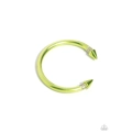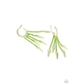 Strands of metallic green chain are embellished with low-hanging metallic green spikes from a rhinestone-encrusted metallic green hoop for a punk-inspired statement. Earring attaches to a standard post fitting. Hoop measures approximately 3/4" in diameter.