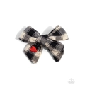 The corner of a rustic black and white plaid bow is stitched in a dainty red heart accent, creating a girly centerpiece. Features a standard hair clip on the back.