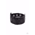 A black leather band is threaded through the center of interlocking square leather links, creating a plaited pattern around the wrist. Features an adjustable snap closure.