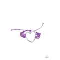 Layers of purple cords delicately knot around an oversized silver heart charm, creating a whimsical centerpiece around the wrist. Features an adjustable sliding knot closure.