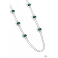 Pressed in sunburst-like, rhinestone-encrusted pronged silver fittings, a collection of emerald-cut green gems are infused between a double-strand of silver chains for a standout statement. Features an adjustable clasp closure.