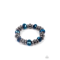An oversized assortment of textured gunmetal rings, smooth gunmetal beads, and metallic blue crystal-like beads are threaded along stretchy bands around the wrist for a glitzy finish.