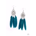 Three Mykonos Blue feathers swing from the bottom of a dizzying silver frame featuring airy filigree detail, resulting in a flirtatiously colorful fringe. Earring attaches to a standard fishhook fitting.