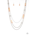 Ornate silver accents, glassy beads, and polished orange beads trickle along strands of shimmery silver chains for a whimsical look. Features an adjustable clasp closure.
