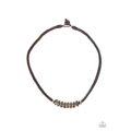 A section of rustic brass and shiny silver discs glide along the center of a braided brown cord, creating an urban centerpiece below the collar. Features a button loop closure