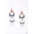 A Meerkat teardrop bead sits atop stacked silver frames that are linked together to allow flowy movement. Featuring tribal inspired patterns, the dramatically stacked frames give way to flared rods for an edgy fringed finish. Earring attaches to a standard fishhook fitting.