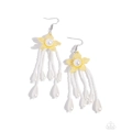 Featuring a white pearly center, a faceted dainty yellow flower blooms from the ear. Strands of pearly white seed beads cascade below the floral centerpiece giving way to oval white teardrop beads for a refined radiant look. Earring attaches to a standard fishhook fitting.