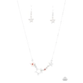 A mismatched collection of airy silver stars and red rhinestone dotted star frames delicately link below the collar, creating a stellar patriotic inspired pendant. Features an adjustable clasp closure.