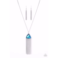 Featuring an iridescent UV shimmer, an oversized blue triangular gem swings from the bottom of a lengthened silver chain. A curtain of silver chains streams out from the bottom of the sparkly pendant, adding playful movement to the glamorous statement piece. Features an adjustable clasp closure.