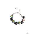 Triangular cut black beads and oil spill gems alternate around the wrist, creating a prismatic pop of color. Features an adjustable clasp closure.