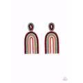 Infused with a single row of glassy white rhinestones, dainty strands of red, black, turquoise, orange, white, and red seed beads stack into a colorful rainbow at the bottom of a matching seed beaded fitting. Earring attaches to a standard post fitting.