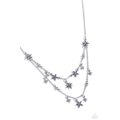 Haphazardly scattered across two dainty silver chains, a constellation of various silver stars, some with light amethyst iridescent centers, cascades below the neckline for a stellar finish. Features an adjustable clasp closure. Due to its prismatic palette, color may vary. Sold as one individual necklace. Includes one pair of matching earrings.