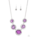 Featuring a refracted shimmer, asymmetrical, glassy purple gems sparkle atop textured silver discs as they delicately link into an edgy statement piece below the collar. Features an adjustable clasp closure.