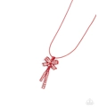 Dipped in a vibrant red hue, a red bow embellished with glistening white rhinestones curls and loops below the neckline, featuring tapered ribbon-like ends that are also adorned in glistening white rhinestones that gradually increase in size for a radiantly refined look. Features an adjustable clasp closure.