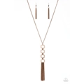 Four copper hexagon frames connect at the bottom of a lengthened copper chain, creating an edgy stacked pendant. A glistening copper tassel swings from the bottom of the geometric pendant, adding movement to the modern piece. Features an adjustable clasp closure.