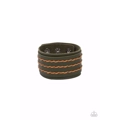 Three rows of brown cording are laced down the center of an Olive Branch leather band that is studded in place across the front of a thick Olive Branch leather band, resulting in a rustic flair around the wrist. Features an adjustable snap closure.