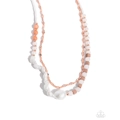 Milky white beads in various shapes alternate with shiny copper beads, increasing in size as they cascade down the neckline. Replacing the shiny copper beads, Brush cubed beads alternate with the larger milky white beads leading the eye to an oversized, texture-brushed ivory pearl center. The other side of the abstract necklace brings in pops of color with milky Desert Flower beads that alternate with shiny copper beads that eventually give way to twists of baroque ivory pearls. A dainty shiny copper abstract chain layers above the fanciful display, creating additional warmth and texture. Features an adjustable clasp closure.
