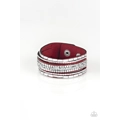 Featuring round and emerald style cuts, glassy white rhinestones join flat silver cubes and metallic prism rhinestones along a red suede band for a sassy look. Features an adjustable snap closure.