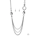 A mismatched collection of oversized gunmetal beads, hoops, and textured gunmetal accents give way to layers of gunmetal chains down the chest for an edgy industrial look. Features an adjustable clasp closure.