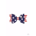 A glittery silver star dots the corner of a leathery bow adorned in red and white stripes and white stars against a blue background, creating a patriotic centerpiece. Features a standard hair clip on the back.