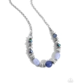 Faceted white and blue oil spill beads, silver discs, sparkle-infused silver beads, Chambray Blue and navy beads in various shapes, and hammered rings coalesce below a classic silver chain for a refined, radiant display. Features an adjustable clasp closure.