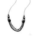 A collection of black, smoky, and white rhinestones coalesce into three layered rows of twinkling brilliance. Complementing the varying shades of black and gray, the faceted gems cascade below two larger black rhinestones with clusters of smoky and white gems in various sizes, adding drama and elegance to the design. Features an adjustable clasp closure.
