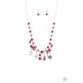 Infused with shiny silver beads, red pearls, and dainty crystal-like accents, and a charming collection of shimmery silver heart and key charms dangle below the collar in a romantic fashion. Features an adjustable clasp closure.