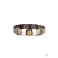 Infused with a brass studded centerpiece, gunmetal frames, brass links, and pieces of twine adorn a brown leather band for a rustic compilation. Features an adjustable snap closure.