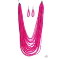 Suspended between two gunmetal fittings, row after row of countless strands of Pink Peacock seed beads layer below the collar. Dainty gunmetal seed beads are sprinkled across the strands for a seasonal finish. Features an adjustable clasp closure.
