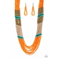 An assortment of orange, brass, tan, black, and turquoise seed beads are threaded along invisible wires, creating colorful layers across the chest. Features an adjustable clasp closure.